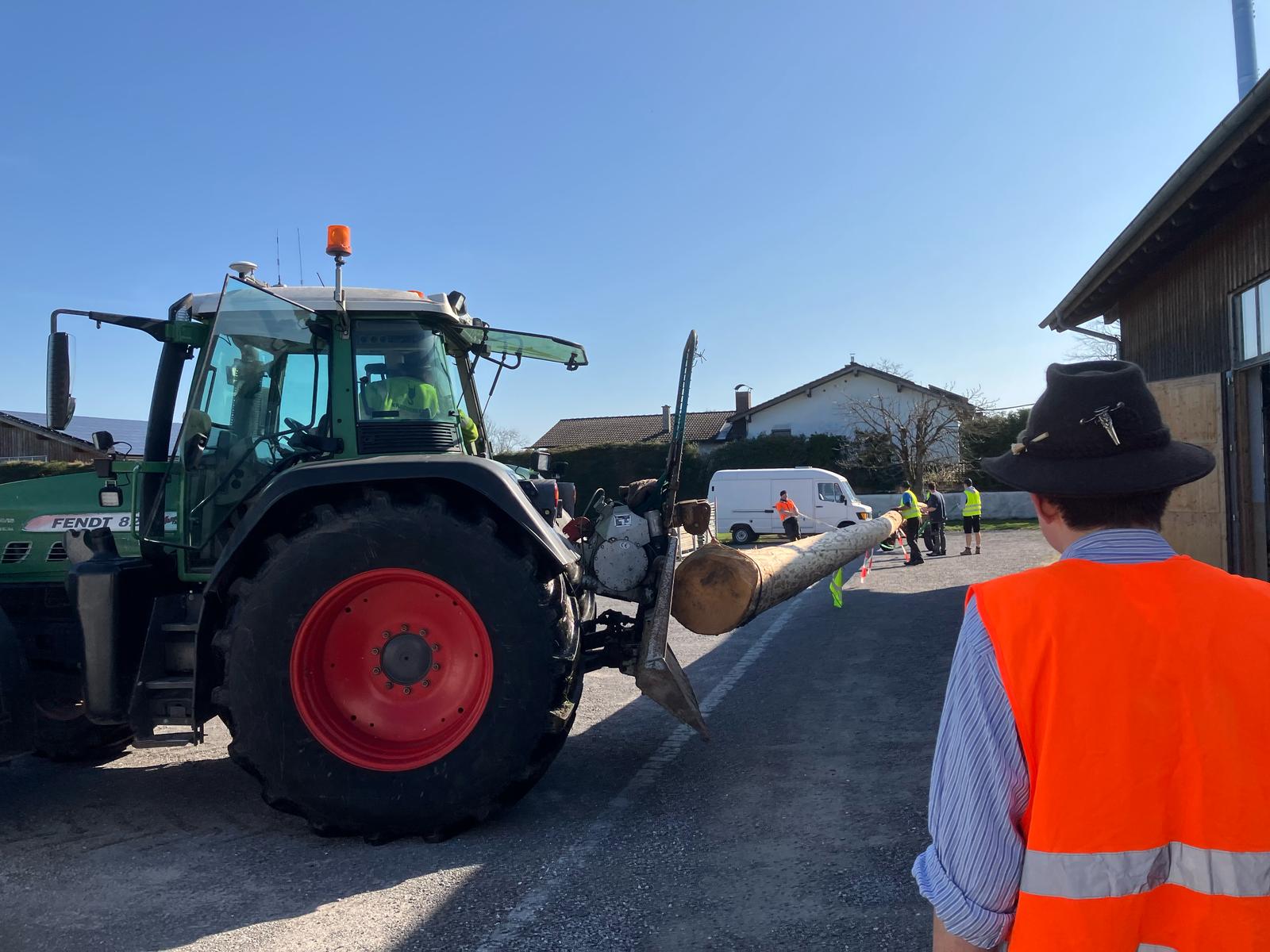 Am Sa. 5. April 2025 durfte unser neuer Maibaum seinen „Liegeplatz“ im Oberland nun endlich verlassen. In einer Rekordzeit von 45 Minuten transportierte Bartholomäus Heidenthaler das „Stangerl“ souverän die 12 km lange Strecke vom Irschenberg über Götting bis zum Rumpel in Sonnenwiechs.