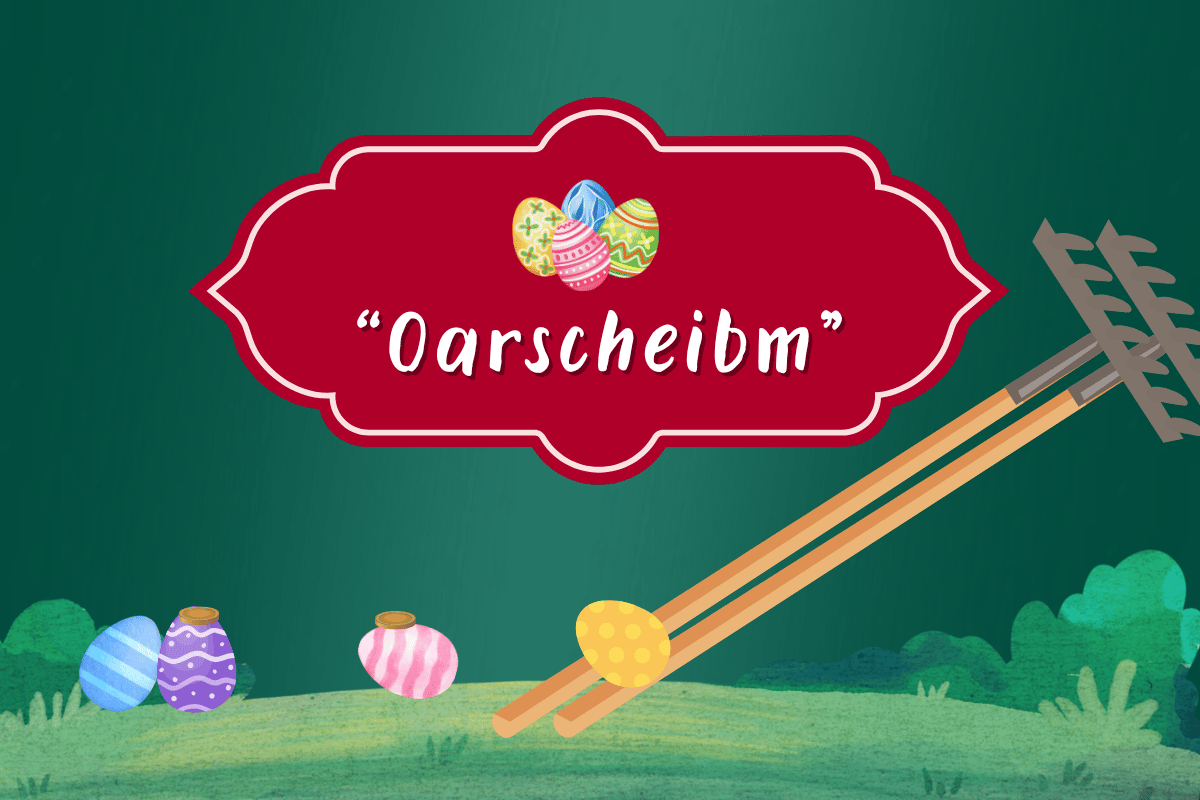 „Oarscheib’m“ oder „Oascheim“ ist eine alte, bayerische Tradition, bei der zwei Rechen so nebeneinander bzw. ineinander verhakt platziert werden, dass eine Rinne entsteht. In dieser Rinne lassen die Teilnehmer ihre Ostereier ins Gras hinunterrollen. So geht das Spiel: Auf das erste Ei, das über die Rinne im Gras landet, wird ein Cent gelegt. Die Mitspieler müssen jetzt auf die gleiche Weise über die Rechenstiele versuchen, mit ihrem Ei die Münzen von den anderen Eiern runterzustoßen. Wem dies gelingt, darf sie behalten.